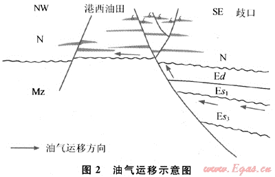 港西地區斷層發育,新近系和古近系又是不整合接觸,這為港西凸起的淺層氣從深層往上運移創造了很好的條件(圖2),而且當斷層切過深部油藏時,地層壓力驟然下降,天然氣會不斷地從石油中析出,沿著斷層向上運移,形成純氣藏或氣頂。