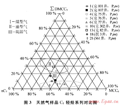 此外,利用C7輕烴系列化合物和烷烴碳同位素值[13~15]也可有效判別天然氣成因類型。如圖3所示,天然氣樣品明顯呈3個點群分布:Ⅰ類甲基環己烷(MCC6)含量相對較高,二甲基環戊烷(DMCC5)含量低(小于10%),為典型的煤型氣;Ⅱ類二甲基環戊烷的相對含量則有明顯增高(大于20%),屬油型氣;Ⅲ類C7輕烴系列的相對含量介于Ⅰ類和Ⅱ類之間,為油型氣和煤型氣的混源氣。