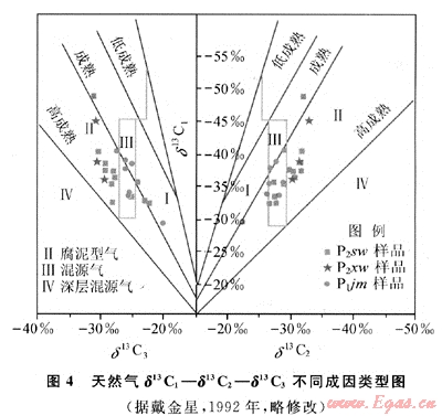 結合天然氣樣品在δ13C1-δ13C2-δ13C3關系圖版(圖4)上的分布特征,可綜合判定研究區佳木河組分布有干酪根初次裂解而成的煤型氣和混源氣2種天然氣,下烏爾禾組天然氣均為原油二次裂解而成的油型氣,而上烏爾禾組三者皆有分布。