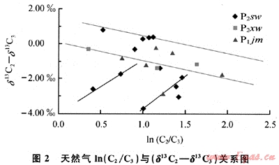 與干酪根初次裂解氣相比,原油二次裂解氣以C3的遞減速率高為特征。因此,利用(δ12C2-δ13C3)值與ln(C2/C3)值相關關系可有效區分干酪根初次裂解氣和原油二次裂解氣[11~12]。據此可判斷下烏爾禾組天然氣均為原油二次裂解成因氣,而佳木河組和上烏爾禾組天然氣成因類型相對多樣,既有干酪根初次裂解成因天然氣,也有原油二次裂解成因氣,同時也可能存在二者混合氣(圖2)。