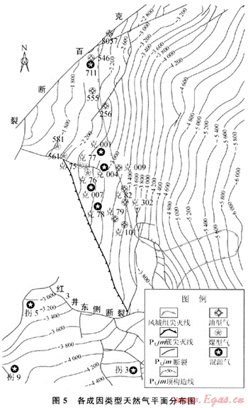 不同類型天然氣在平面上呈條帶狀分布(圖5)。油型氣主要沿風城組尖滅線分布,該處緊鄰風城組烴源巖,油型氣供給充足。混源氣均分布于風城組尖滅線以外的區域,該區域為佳木河組烴源巖的主要分布區,同時也是風城組烴源巖排烴的有利指向區,易于煤型氣與油型氣發生混合。佳木河組內部的煤型氣由于為自生自儲成因,分布相對廣泛;而上烏爾禾組煤型氣均集中分布在五區南斷裂附近,該斷裂為斷至佳木河組內部的斷源斷裂,表明斷源斷裂是佳木河組烴源巖垂向排烴的優勢通道。