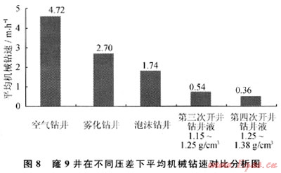 窿9井在鉆井過程中遇到各種井下復雜事故,該口井采用了氣體、霧化、泡沫以及鉆井液鉆井方式[7]。現場實踐表明,井底壓差越小,則機械鉆速越大(圖8)。因此,鉆前需要認真研究該區塊的地質特征以及分析工程難點,評價該區塊的油、氣、水分布特點和井壁穩定性效果,然后結合具體的鉆井方式計算合理的井底壓差來達到提速增效的目標。