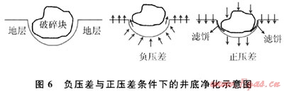 對滲透性地層,地層內飽和的流體可以流動(圖6)。負壓差條件下向外流動的流體將破碎巖屑浮起,推離井底,避免了重復破碎和產生更多的微粒。在正壓差條件下,正壓差下向地層內的滲流失水,首先將巖屑壓在井底,之后迅速形成淺層濾餅,不但將巖屑緊緊壓在井底,造成巖屑的二次破碎,而且造成液柱壓力與孔隙壓力之差值集中作用于井底薄層,形成該層的集中應力。