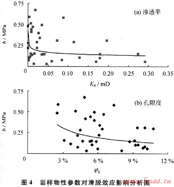 滑脫效應強弱程度可采用滑脫因子描述;滑脫因子(b)越大對氣體滲流影響越大,反之越小;不同物性參數條件下氣體滑脫效應現象程度強弱不一樣。研究表明:隨著氣相有效孔隙度、有效滲透率增加,滑脫效應影響程度相應減弱(圖4)。對于廣安氣田須六段氣藏,含水巖樣滑脫因子介于0.063~0.675MPa之間。