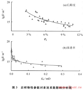 高速非達西滲流特征是多孔介質中氣體滲流普遍存在的特殊滲流現象。不同的物性參數條件下高速非達西滲流效應對氣體滲流的影響程度不同,紊流系數(β)的大小直觀反映了高速非達西對氣體滲流的影響程度。物性參數與紊流系數關系實驗結果見圖3。總體而言,隨著氣相有效孔隙度及氣相有效滲透率增加,紊流系數逐漸減小,表明儲層物性越差高速非達西滲流效應越明顯。
