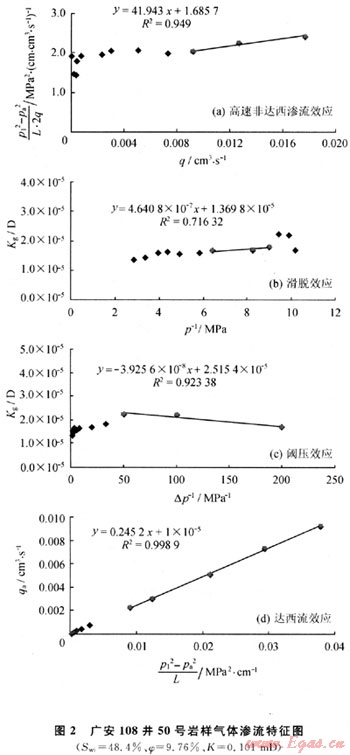 國內外長期的滲流實驗研究確認了氣體特殊滲流效應對應的實驗現象,并根據大量的實驗數據建立了相應的數學描述關系式[2~4]。2008年馮曦等根據單相氣體不同滲流運動方程建立了對應的滲流效應診斷方法,提高了診斷精度[5~6]。筆者以上述方法為基礎,對所有實驗樣品的滲流機理進行診斷分析。