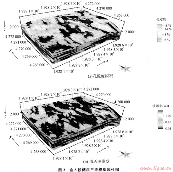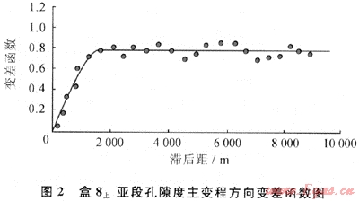 從表2中可以看出:由于盒8上亞段儲層和盒8下亞段儲層分別為曲流河和辮狀河沉積相,其儲層屬性的變差函數存在較大的差異。以孔隙度為例,雖然二者的主變程方向都為近于南北向,并且都可以用指數模型進行擬合,但盒8上亞段儲層變差函數的主變程是1645m,而盒8下亞段儲層是819m,說明盒8上亞段儲層孔隙度沿主變程方向連續性更好。但是盒8上亞段儲層孔隙度次變程為425m,比盒8下亞段儲層孔隙度次變程503m要短68m,說明盒8上亞段儲層孔隙度側向變化比盒8下亞段快。二者的垂直變差函數分別為7.8m和6m,說明孔隙度在垂直方向上變化遠比平面方向變化快,也就是說,儲層的垂直方向的非均質性遠強于平面非均質性。盒8上亞段與盒8下亞段儲層滲透率變差函數具有相似的變化規律,只是主變程和次變程都比孔隙度小,說明滲透率在各方向的變化都比孔隙度快,反映儲層滲透率的非均質性比孔隙度強。由此可見,準確變差函數的求取,可有效反映儲層非均質性大小及方向。
