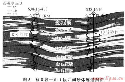 由此可見,應用儲層三維地質模型,可以準確地預測有效儲層的規模及其空間分布,通過沿任意方向切取垂向和水平剖面,可以對儲層進行定量評價。圖5為通過儲層滲透率三維模型切取的過井剖面,從圖中可以直觀地看出儲層砂體的井間連通或者尖滅情況,定量分析儲層物性的橫向變化,準確地界定儲層砂體的幾何形態。如S38-16井生產近半年,關井63d,在盒8下亞段1層第10號砂體測得地層壓力為19.7MPa,而S38-16-4井在同一地層的8號砂體地層壓力為29.3MPa,反映兩口井砂體不連通或物性差別極大,與儲層地質模型基本吻合。通過工區內16口測壓井、2個井組干擾試驗以及投產井生產動態特征,證實了所建立的三維地質模型精度較高,客觀地反映了有效儲層空間分布,也表明所提出的建模方法對低滲透河流相儲層建模是有效的。