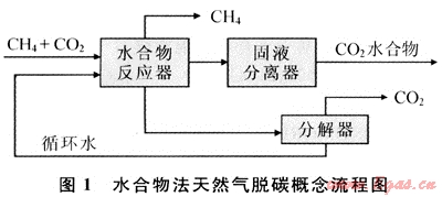 圖1為利用水合物分離技術進行天然氣中捕集CO2的流程:將經過預處理過酸性天然氣通入水合反應器,在合適的操作條件下使混合氣中易生成水合物的CO2組分生成CO2水合物,被提濃的CH4自反應器頂部引出。所生成的CO2水合物經脫水后可直接利用[20],或隨水轉入水合物分解器中,分解后回注油氣藏以提高采收率。分解后的水或水與添加劑的混合物返回水合反應器,循環利用。