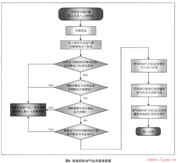 CNG加氣站進行信息化配套改造建設,實現充裝記錄的實時上傳和斷點續傳功能,滿足在線和離線加氣的需要,并實現手持瀆寫器程序的在線更新,滿足對加氣控制變更的需要;進行加氣機改造,加氣人員用手持讀寫器對標簽信息進行讀寫、并對加氣槍進行控制,對符合條件的氣瓶打開加氣槍充裝,不合格氣瓶加氣槍不能打開,并顯示不合格原因,從而實現對氣瓶安全充裝的動態管理。