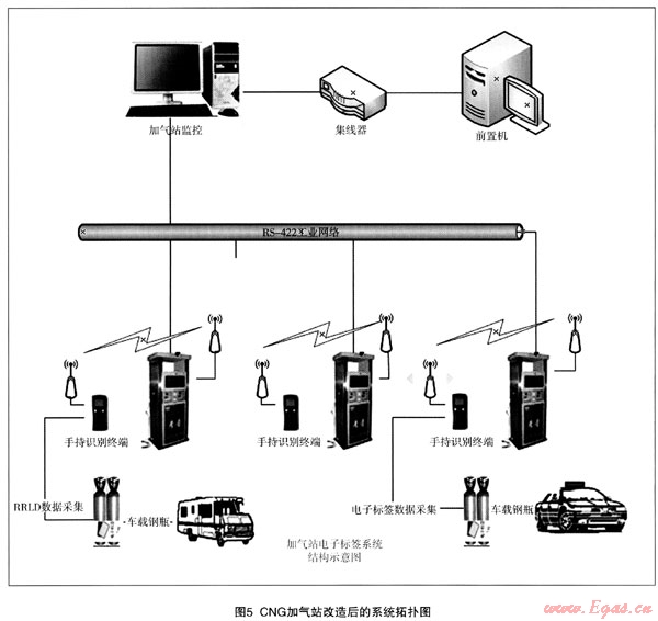 加氣站充氣前,加氣人員首先應通過手持機掃描汽車/氣瓶電子標簽讀取相關信息,手持機自動分析這些信息,如判斷該氣瓶是否合格、是否在有效檢驗周期內等,如果合格,加氣機自動啟動,自動記錄該次加氣數據,通過無線傳輸技術傳輸到加氣管理子系統,加氣管理子系統自動上傳到數據中心,實時完成加氣記錄的自動記錄和上傳,最終使非法氣瓶不能得到加氣。