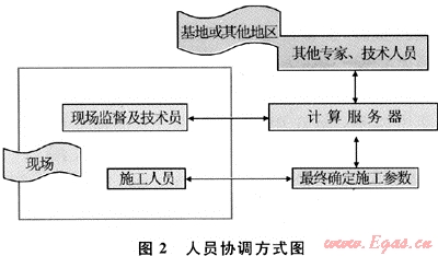 該方法不僅解決了數據計算速度問題,而且計算結果可以保存在服務器的數據庫中,可以由多個手機客戶端反復調用,便于多名工程技術人員在不同地區、環境下共同參與指導、監督工作,使現場在遇到復雜情況時可以及時得到油氣田資深專家的意見,人員之間的協調方式如圖2所示。