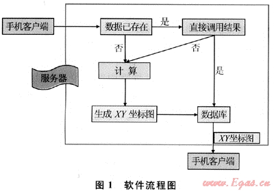 由于該軟件采用循環迭代試算法求解,涉及的數據計算量較大。因此,主要計算功能無法用手機完成,需要與服務器進行數據通訊,采用的方式如圖1所示。由手機客戶端提交計算參數,利用主控服務器進行計算,計算后利用計算結果產生直觀的XY坐標圖,再將圖片傳輸回手機并顯示。