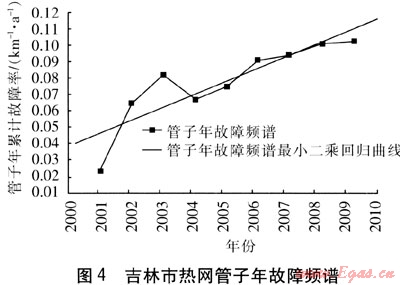 ③ 對(duì)吉林市熱力有限公司熱網(wǎng)管子進(jìn)行年故障頻譜分析發(fā)現(xiàn),隨著運(yùn)行年份的延續(xù),吉林市熱網(wǎng)管子年累計(jì)故障率整體呈上升趨勢(shì),且熱網(wǎng)管子年累計(jì)故障率的增長(zhǎng)速率為0.0079km-1·a-1。