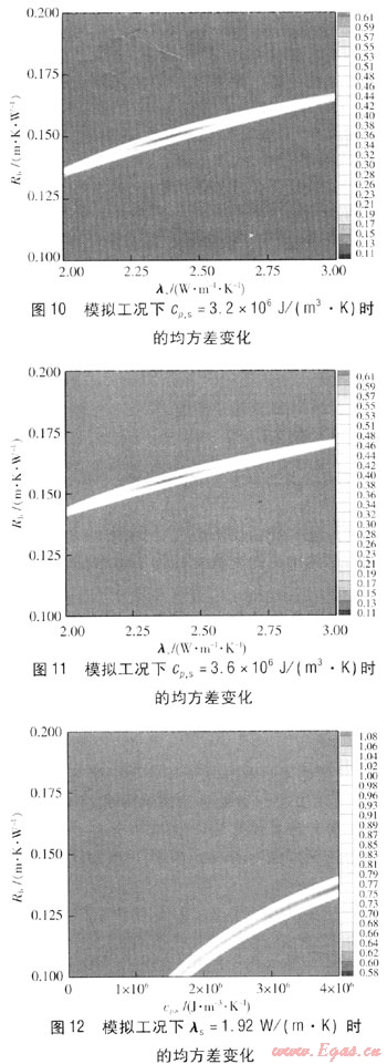 運用參數估計法,給λs賦值:1.92、2.40、2.88W/(m·K),在參數估計中,分別對cp,s、Rb在一定的取值范圍內連續賦值。通過計算機編程計算得到模擬工況下的均方差變化情況見圖12~14,圖右側色標為均方差。由圖12~14可知,模擬工況下的結果不理想,均方誤差較小的淺色云圖中深色區域對應多組cp,s、Rb,這樣就很難確定哪組數值是最優值,即在參數估計中對其他參數的影響比較大。