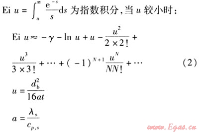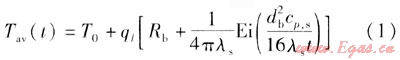 地埋管換熱器的傳熱模型主要有線熱源模型、柱熱源模型。線熱源模型是基于1948年Ingersoll和Plass等人發展的Kelvin線熱源理論[8]。工程上常見的地埋管換熱器的直徑一般為26~36mm,鉆孔深度為40~200m,與鉆孔深度相比,地埋管的直徑很小。在地埋管換熱器工作時,相當于在半無限大介質中,鉆孔中心的一根線熱源與周圍巖土進行熱交換。另外,假設沿地埋管長度方向傳熱量忽略不計,周圍巖土均勻且線熱源與巖土的傳熱量恒定。由于該方法不受具體換熱器形式的限制,計算較簡單,且能滿足一般工程中土壤源熱泵系統設計計算的要求,具有較廣泛的實用性。根據假設,可以得到地埋管內流體平均溫度與鉆孔周圍巖土初始平均溫度及其他參數之間的關系式[9]: