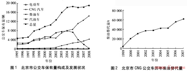 圖1為北京市公交車保有量構成及發展狀況,它顯示了1995—2008年北京市公交車總量以及其中汽油車、柴油車、CNG車和電動車這4種不同燃料類型汽車的發展趨勢。可以看出,在1999—2008年這10年間,北京市天然氣公交車保有量的年均(3年滑動平均)增長率達到了21%,遠高于同期北京市公交車總保有量7%的增長率,天然氣公交車同時也是各類公交車型中增長速度最快的車型。