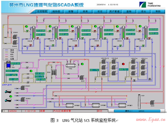 SAE-LSMS系統已成功在國內應用多年,2005年深圳美視電廠總管式增壓40kfg,氣化量48,000NM3/H,2007年深圳燃氣集團梅林LNG應急調峰站單元式增壓20kfg,氣化量小時40,000NM3/H,2008年南京港華兩個2500立方LNG子母罐氣化站均已應用該系統。均取得了較好的效果。圖5為廣東潮州子母罐式LNG氣化站SCS系統監控畫面。