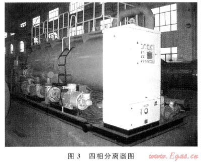 四相分離器在密閉系統中發揮重要作用,是其核心裝備。密閉系統中的儲油罐、沉砂罐、鉆井液緩沖罐等后續設備都是為該裝備服務,該裝備的分離效率穩定與否直接關系到整個密閉系統能否正常運行。美國、加拿大、英國等國家的一些石油公司相繼研制出了鉆井液四相分離裝置,并進行了多次現場使用。目前川慶鉆探工程公司鉆采工藝技術研究院對四相分離器進行了研制(圖3),并取得了重要進展[3~7]。