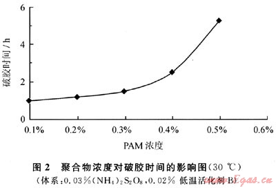 將不同質量分數的PAM加入相同的氧化還原體系,并加入調節劑A后,與ZrOCl2為1%的溶液按100:3.5的配比混合進行交聯,測得在40℃破膠時間(圖2)。