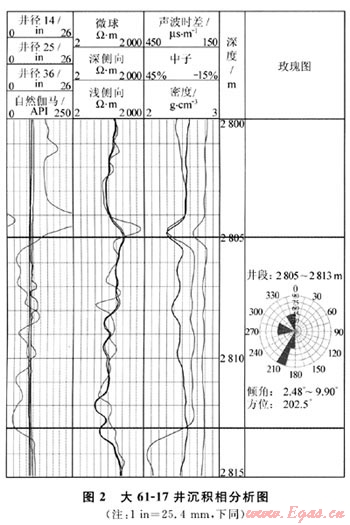 地層傾角測(cè)井是一種能直觀反映單井剖面地質(zhì)構(gòu)造的測(cè)井方法,通過(guò)相關(guān)對(duì)比等方法處理得到的傾角矢量圖(圖1),可以了解目的油氣藏砂體的地層產(chǎn)狀特征、砂體展布及古水流和物源方向、判斷地應(yīng)力方向、識(shí)別裂縫等[1~7]。