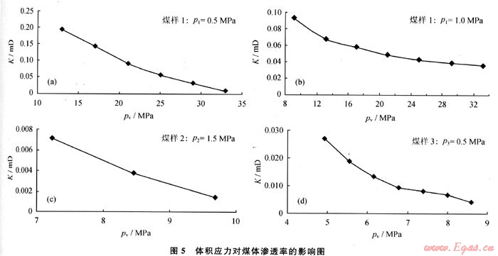 1) 實(shí)驗(yàn)研究了體積應(yīng)力變化情況下煤體的滲流規(guī)律。結(jié)果表明,煤體滲透率隨體積應(yīng)力的增加呈負(fù)指數(shù)規(guī)律衰減。