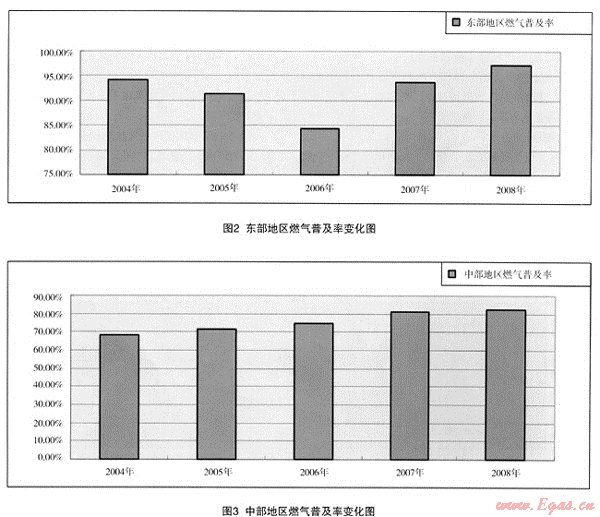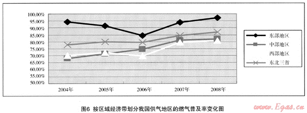 (1) 我國東部地區的燃氣普及率總體上高于其它地區,其次為東北三省,中部和西部地區差別較少。西部地區有資源優勢,2005年前,普及率較中部地區略高,但2006年后,中部地區又略高于西部地區,證明燃氣普及率從總體上看與地區的經濟發展關系較大,其次才是資源因素。