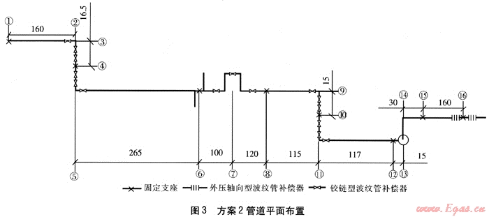 將方案1中節點1~15與方案2進行對比可知,方案1共有固定支座10個,其中2、5、9、15為大推力固定支座,而方案2在平面轉角處利用鉸鏈型波紋管補償器,加大補償段長度,并在中間長直管段上利用管道穿越障礙埋設較深的條件,設置豎向方形彎利用鉸鏈型波紋管補償器補償直管段熱伸長,減少了大推力固定支座數量。