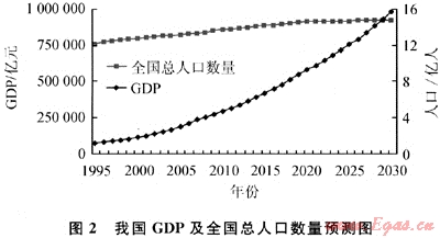 在所建立的系統動力學模型中,GDP與總人口數量是預測我國天然氣消費的重要因素。在進行各個子系統天然氣消費預測時,必須首先掌握這兩個因素的變化規律。根據國務院發展研究中心對我國經濟增長前景的預測以及國家人口和計劃生育委員《國家人口發展戰略研究報告》的基本判斷,我國GDP的總量和未來全國總人口數量預測結果如圖2所示。為了便于計算和對比,GDP以2005年不變價格計算。