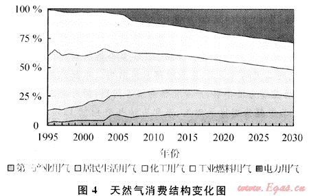 目前我國天然氣消費主體為化工用氣與工業燃料用氣,發電用氣、第三產業用氣以及居民生活用氣的比例相對較小。隨著天然氣消費總量的增長,消費結構也將發生很大的變化,如圖4所示。