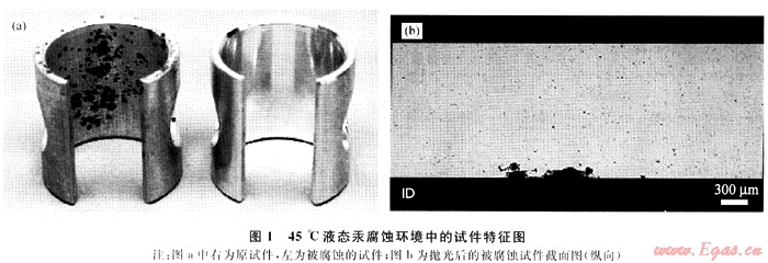 實驗將外徑19.1mm、壁厚1.6mm的6061-T6型鋁無縫管,加工成統一的C形環狀試件(表面積大約為20cm2,如圖1-a右圖所示);然后在45℃、22℃、O℃的情況下,分別放入液態汞和汞蒸氣的環境中進行6d的模擬腐蝕實驗。