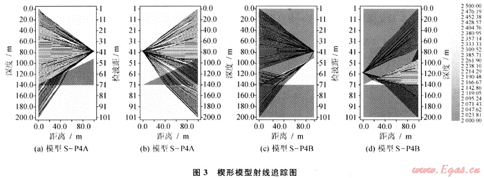 圖3為兩個楔形模型的射線追蹤圖,比較可以發現,對于尖滅傾斜層來說,激發井相對地層為下傾或接收井相對地層為上傾時(圖3-b、圖3-d),其經過尖滅傾斜層射線明顯多于上傾激發或上傾接收(圖3-a、圖3-c)。顯而易見,利用下傾激發上傾接收的井間資料進行偏移成像或層析成像,其得到的結果肯定優于上傾激發下傾接收的結果。圖4是與圖3-c、3-d對應的物理模型實驗炮集記錄,也表現出同樣的結果。數值模擬和物理模擬結果均表明下傾激發、上傾接收得到的井間記錄能更好地反映井間介質的變化。