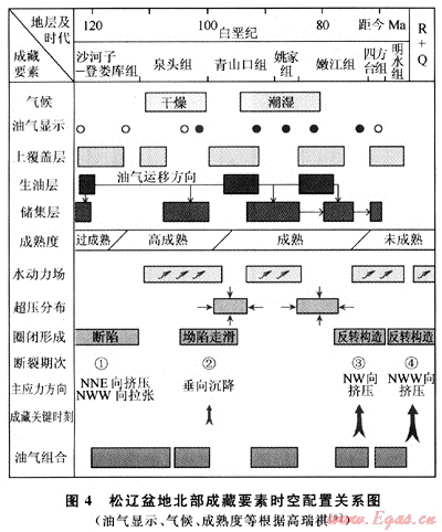 白堊紀末期青山口組和嫩江組的烴源巖正處于高成熟期,生排烴速率較高,加上嫩江組三、四段的黑帝廟油層的存在,都為淺部油氣成藏提供了有效的油源。