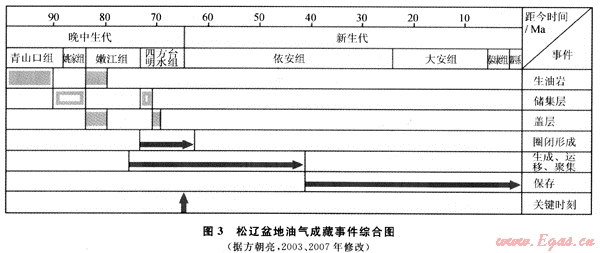 1) 松遼盆地晚期各種成藏要素在時間上和空間上形成了良好的配置關系,這為油氣在淺部地層成藏提供了基本的條件,淺層油氣是沿斷層向上運移的結果。確定晚期成藏調整的關鍵時刻是明水期-依安期末。
