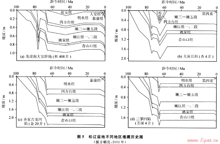埋藏史研究結果表明,松遼盆地北部從青山VI沉積開始,不同地區的埋藏史有所差異(圖5),正是這種埋藏歷史的差異是導致松遼盆地北部油氣聚集成藏的主要動力學原因之一。