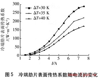 換熱介質(zhì)溫度對散熱器傳熱溫差和表面?zhèn)鳠嵯禂?shù)均有影響。對于高熱流密度的換熱,單純提高表面?zhèn)鳠嵯禂?shù)效果并不明顯,且表面?zhèn)鳠嵯禂?shù)的提高有一定限度,改變換熱介質(zhì)溫度、提高傳熱溫差可以極大增強(qiáng)換熱。因此,熱電制冷適用于電子部件等高熱流密度設(shè)備的冷卻。