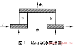 由兩種具有不同熱電效應(yīng)的導(dǎo)體構(gòu)成的回路,通以直流電時(shí)產(chǎn)生吸熱現(xiàn)象,這種現(xiàn)象稱為熱電制冷。半導(dǎo)體材料具有較高的熱電勢,可以成功地用來做成小型熱電制冷器,熱電制冷原理見圖1。N型半導(dǎo)體和P型半導(dǎo)體構(gòu)成的熱電制冷元件,用銅板和銅導(dǎo)線將N型半導(dǎo)體和P型半導(dǎo)體連接成一個(gè)回路,銅板和銅導(dǎo)線只起導(dǎo)電的作用。此時(shí),一個(gè)接點(diǎn)變熱,一個(gè)接點(diǎn)變冷,如果電流方向反向,那么結(jié)點(diǎn)處的冷熱作用互換。