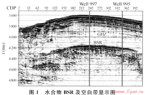 空白反射帶在反射地震剖面上通常與BSR伴生,位于BSR之上。在含天然氣水合物地層中,由于地震波速度增大,使得它與下伏地層之間的反射系數增大,在地震剖面上,天然氣水合物的底邊界出現相應的強反射界面,而在含天然氣水合物的層內,由于沉積物孔隙被水合物充填膠結,使地層變得均勻,減少波阻抗差,地震反射剖面上通常表現為弱振幅或振幅空白帶(圖1)。