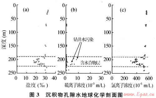 地球化學識別主要基于海底淺表層沉積物、沉積物中的自生礦物及底水的綜合分析和研究。淺層沉積物和底層海水的甲烷濃度異常高,通過對烴類氣體運移路徑的追蹤可以間接識別和評價天然氣水合物;淺層沉積物孔隙水含量和異常是識別水合物層的依據,一般來說,含天然氣水合物的沉積層的孔隙水鹽度和氯度會降低(圖3)。其次孔隙水中的氧化-還原電位和硫酸鹽含量的降低也可能是天然氣水合物存在的標志[8]。