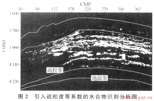 采用疊前AVO反演求得縱橫波速度信息[7]。通常海洋中淺層地層的地震縱波速度為1.6~1.8km/s,在含天然氣水合物層中,地震波速度將提高至1.85~2.5km/s,在速度剖面上,水合物層的層速度變化趨勢呈典型的三段式,即上下低,中間高。同時結合疏松系數、地熱梯度等參數,可以提高水合物識別的可信度(圖2)。