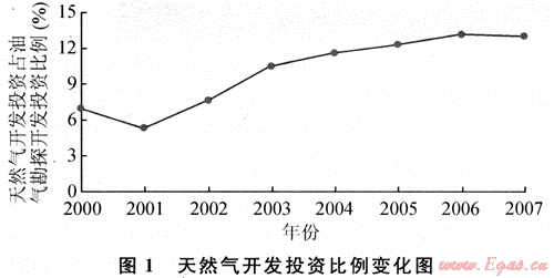 近幾年來,天然氣工業呈跨越式發展態勢,伴隨著天然氣儲量、產量的迅速增長,天然氣開發建設投資規模不斷擴大。從中石油來看,在投資方向上不斷向天然氣業務傾斜,天然氣開發投資比重不斷增加(見圖1),由2000年占公司勘探開發總投資的7%,上升到2007年的13%。