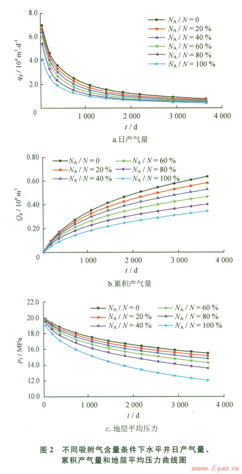 圖2給出了不同吸附氣含量條件下頁巖氣水平井的日產氣量、累積產氣量和地層平均壓力曲線。由圖2可知:吸附氣含量直接影響氣井的初始產量和遞減速度。吸附氣含量由0至100%時,對應的初始產氣量分別為6.97×