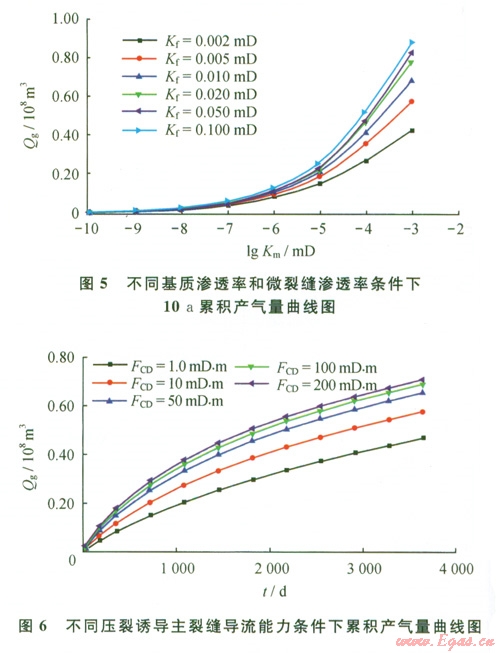 圖4給出了不同級別擴散系數條件下頁巖氣水平井的日產氣量和累積產氣量曲線,由圖4可知:氣體擴散系數由