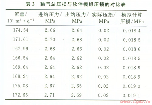 通過輸氣站過程模擬軟件的模擬計算,將計算結果與各主要生產設備的實際壓損數據進行對比,選擇其中具代表意義的單體設備分析結果列于表1。同時,將軟件模擬的全流程參數計算所得的站內壓損與該站實際生產中的壓損數據進行比較列表,結果如表2所示。