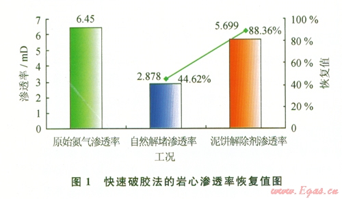 完井后用破膠法清除水平井水平裸眼段的泥餅就保證了氣井的順利投產和良好的產能。破膠液配方使用:原用完井液+5%PF-HBK。破膠液接觸泥餅后,8h可使巖心滲透率恢復值大于80%(圖1),12 h后可達到95%。