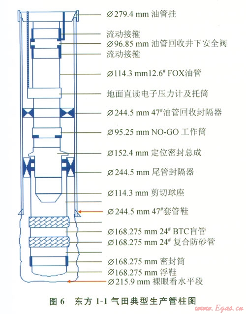 東方l-1氣田具有高產、C02含量較高的特點。作為中海油自營開發的首個氣田在開發所面臨的最大問題就是安全開發問題。作為安全生產的第一屏障生產管柱結構的設計選擇尤其重要。生產管柱的設計和下人須滿足低壓力損耗,使用壽命長,滿足氣藏動態監測的要求[2]。油管選用強度高、密封性好、內孔平滑和可多次重復上扣l3Cr FOX油管。上部設計井下安全閥,保證氣井在緊急狀況下安全可靠關閉,及時切斷氣源。安全閥為全金屬密封(氣密封)。采用雙封隔器結構保證安全生產的需要,增加封隔油套管環空的可靠性,降低完井作業返工率:第一密封由插人密封總成與防砂尾管懸掛封隔器組成,第二密封為油管回收封隔器。管柱底部用液壓剪切坐封球座,避免在大斜度井鋼絲作業坐封封隔器(圖6)。