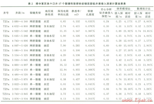 基于上述理論和方法,結合巖心分析、測井、鉆井、地層流體測試資料,對研究工區9口井選擇水基(鹽水)鉆井液的l7個層位裂縫性致密砂巖儲層段鉆井液侵入深度進行了定量計算,結果見表2。
