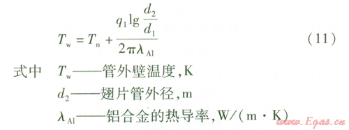 利用通過圓筒壁的導熱公式,計算沒有翅片部分管外壁的溫度Tw,此溫度即為翅片的根部溫度。