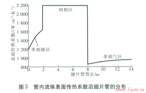 管外壁溫度在單相液區急劇升高,到達兩相區后有一個突降,而后保持不變,到達缺液區后逐漸升高,在單相氣區也是緩慢升高。由管外壁溫度沿翅片管的分布可以看出,在單相液區和兩相區的核態沸騰區,即從人口至管長大約6m處,管外壁溫度較低,容易發生結露或結霜現象。