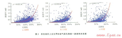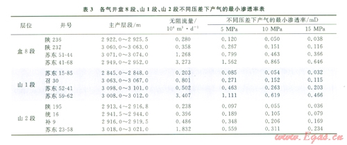 根據單層試氣井試氣資料,在產能一定的情況下,就可以計算出蘇東地區主力氣層段產工業氣的滲透率下限(表3)。根據目前蘇東地區天然氣儲量規范,2 000~3